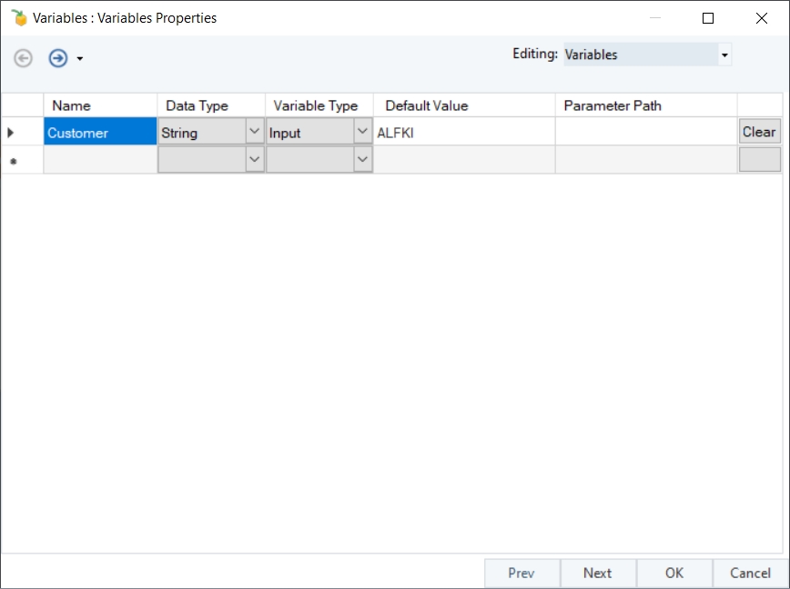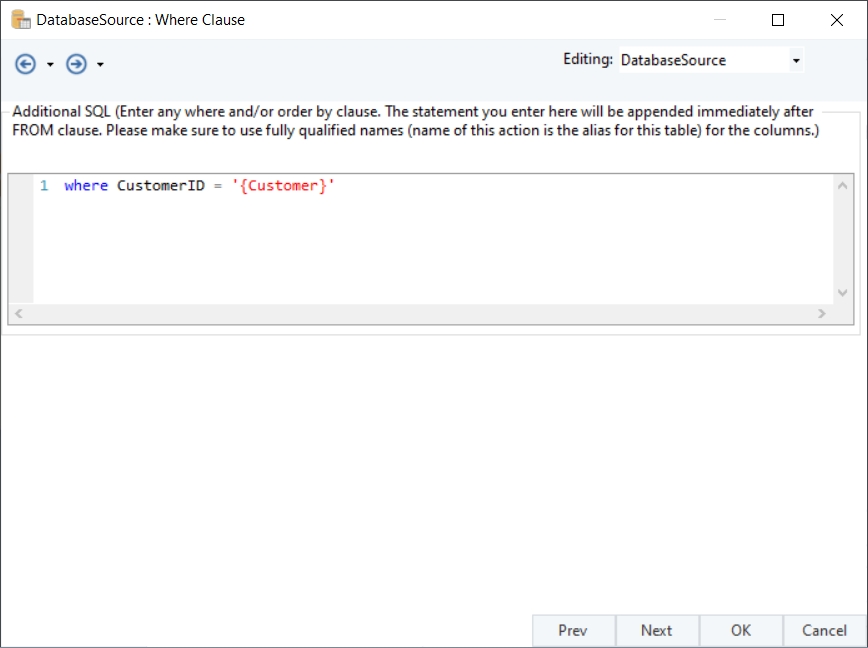 Variables can be used in the Database Table Source object while querying particular records from a Database table. Here, we wish to get the records of particular customers using their Customer ID. Instead of editing the Where clause multiple times, we can just use the variable object.
