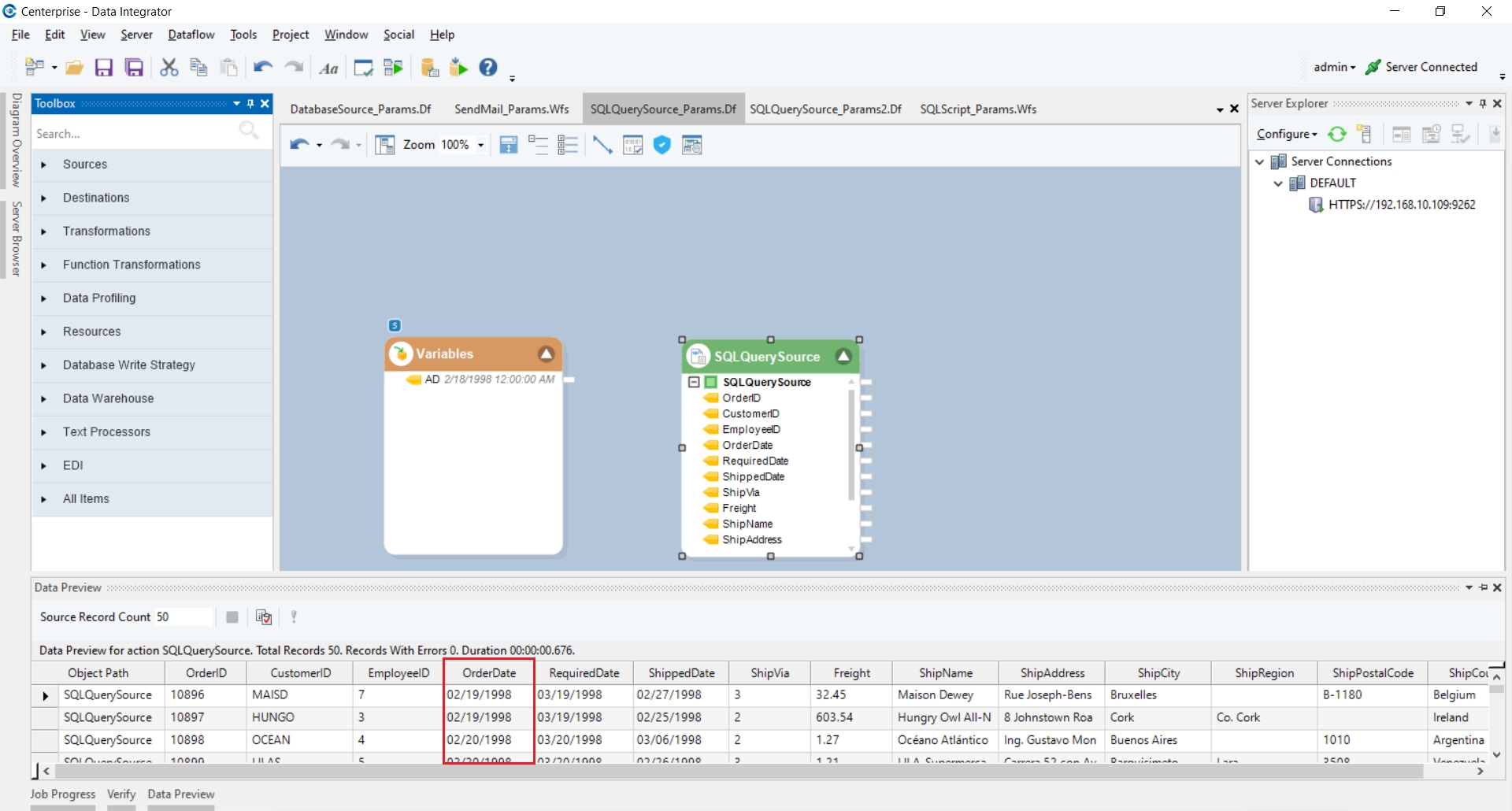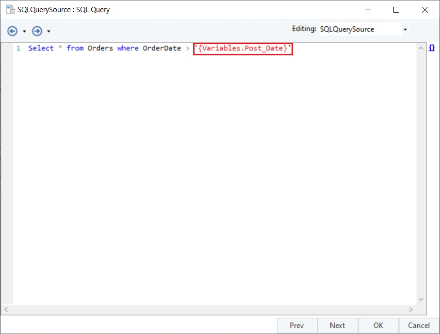 Variables can be utilized while querying data from database tables in the SQL Query Source object. These can be changed according to the requirement. Here, we wish to query data from a sample Orders table after particular dates. Instead of editing the query multiple times, we have used a Variables object where we can change the date as needed.