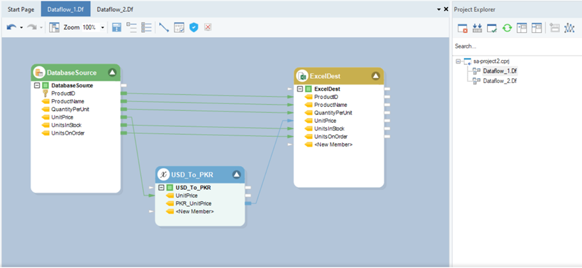 The following dataflow extracts data from a database table using a DatabaseSource object and converts the unit price of an item from USD to PKR using an expression. It then writes the data to an Excel Destination.