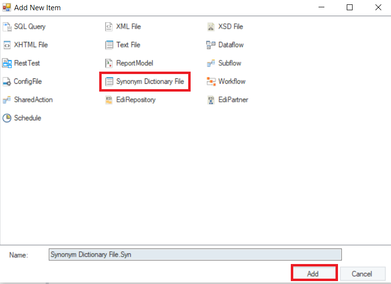 2. Provide the name of the file and click Add. A new text file with a .Syn extension will be added to the project.
