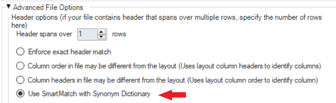 In the properties window, under the Advanced File Options, select the Use SmartMatch with Synonym Dictionary option.
