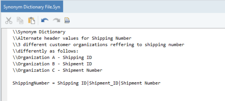 You can add a Synonym Dictionary File to your project and specify alternate header values used by your customers for shipping number. Astera will match for values provided in the dictionary and read data from the incoming source files containing the header variations. In the screenshot below, we have created a synonym file for the example illustrated above.
