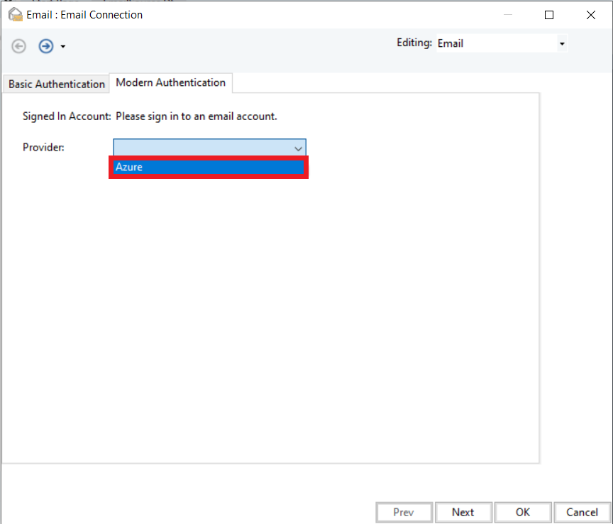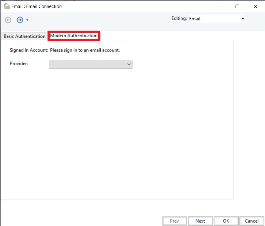 The Email Connection screen will open. On this screen, select the Modern Authentication tab.