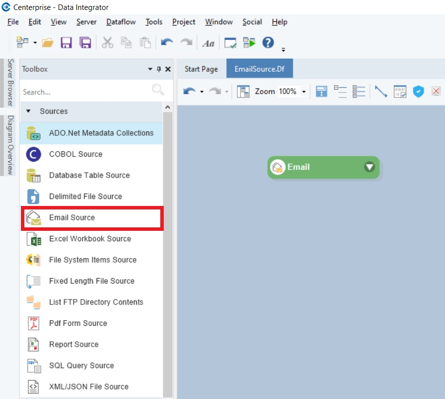 Drag the Email Source object from Toolbox > Sources > Email Source and drop it onto the dataflow designer. If you cannot see the Toolbox, go to View > Toolbox or press Ctrl + Alt + X.