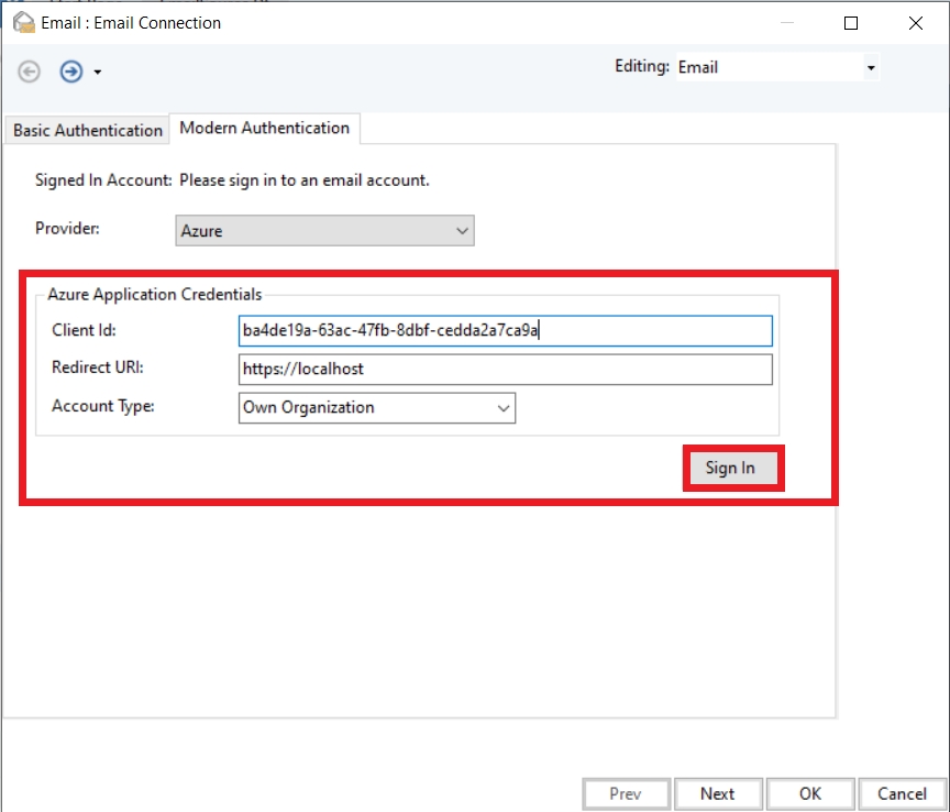 After selecting the Provider, you need to enter Azure Application Credentials. Provide your Application (Client) Id, Redirect URI, and Account Type, and click on Sign In.