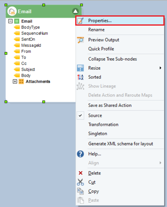 The next step is to configure the Email Source object. To do this, right-click on the object’s header and select Properties.