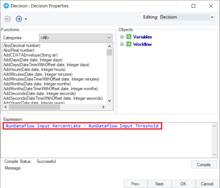 We will now complete our desired use case by using workflow tasks. We can run the dataflow in a workflow using the Run Dataflow object. In our case, we have made the following workflow (shown below) to notify the admin if the PercentLate exceeds the Threshold value. Notice that the PercentLate and Threshold variables appear in the Run Dataflow object because they are defined as output variables.