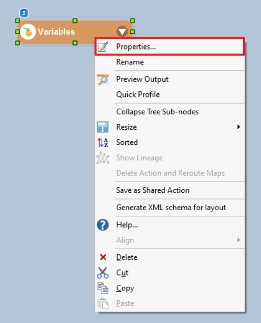 2. Right-click on the Variables object and select Properties. Alternatively, you can also double-click on the object’s header to open Properties.