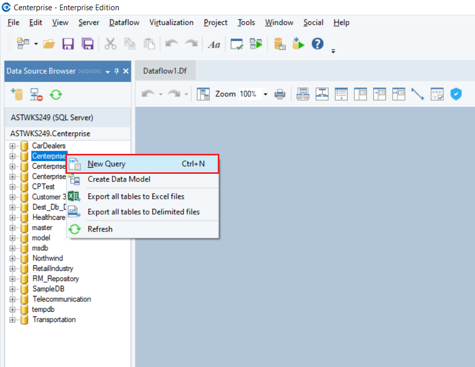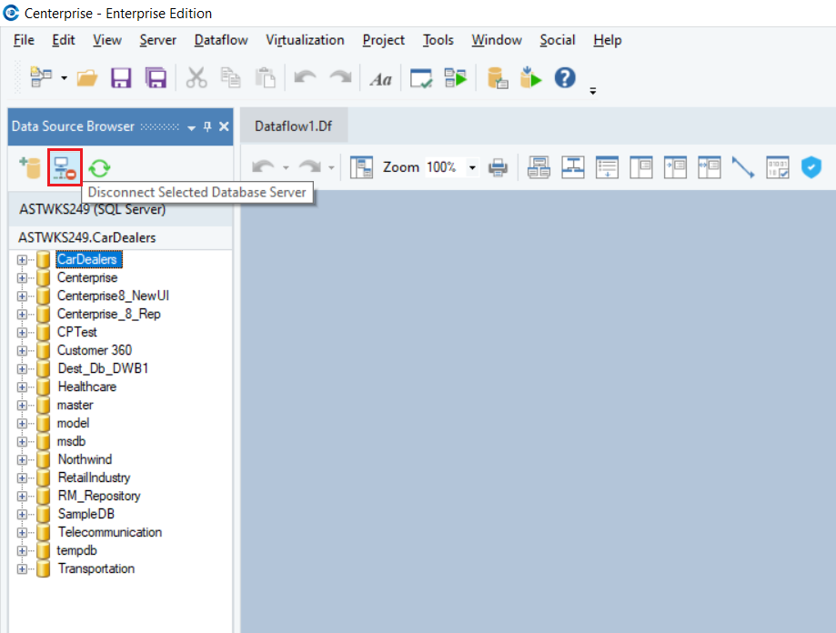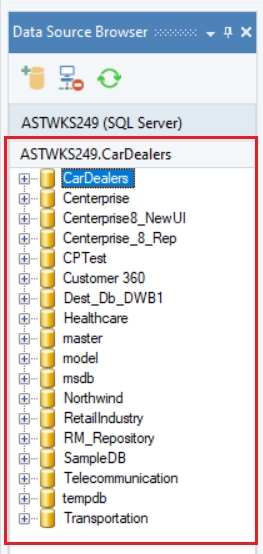 The Data Source Browser enables you to connect to and query data from a database server. Astera allows you to connect to multiple database servers at the same time.