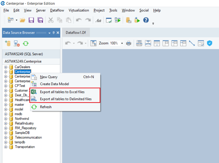 The Data Source Browser can be used to export data to a Microsoft Excel Worksheet or a delimited file from the connected database server in the form of a table. You can right-click on the connected database server to view the available options.