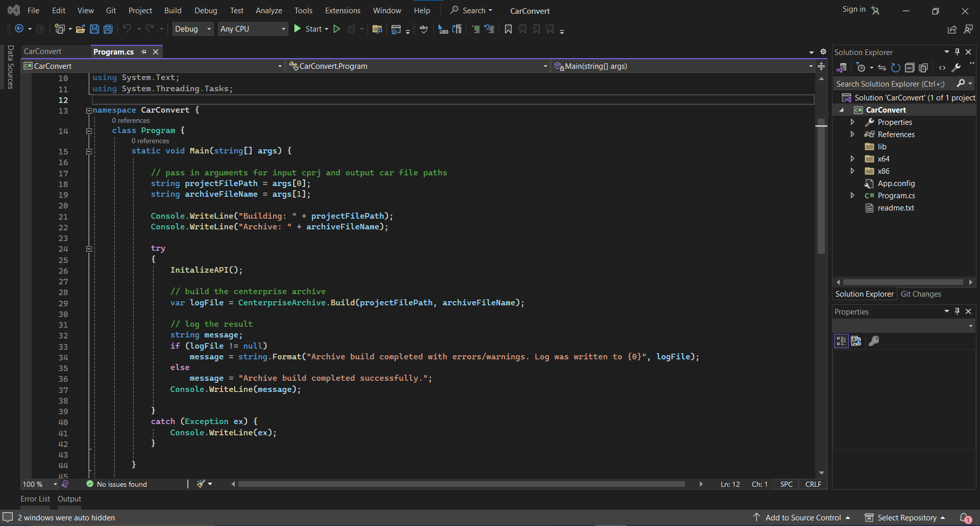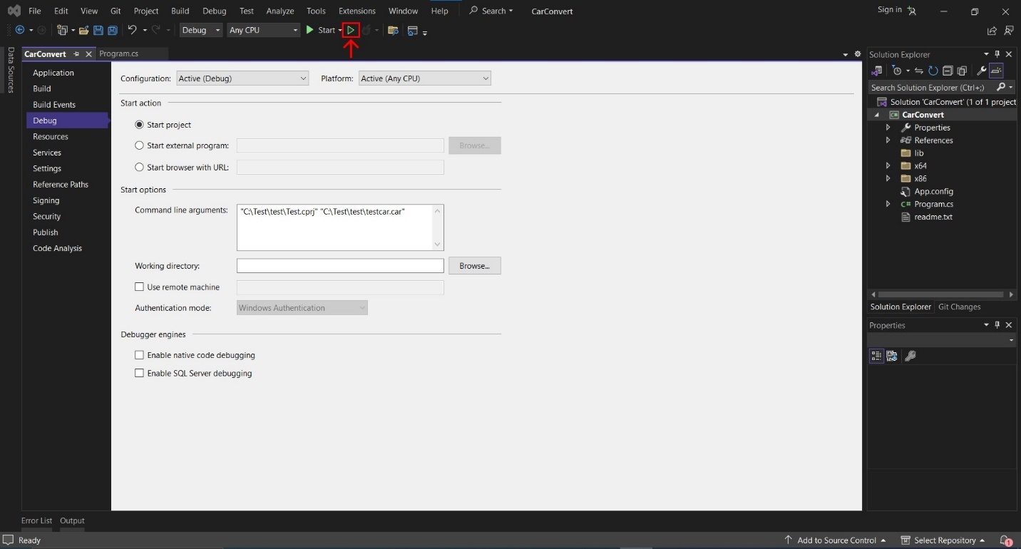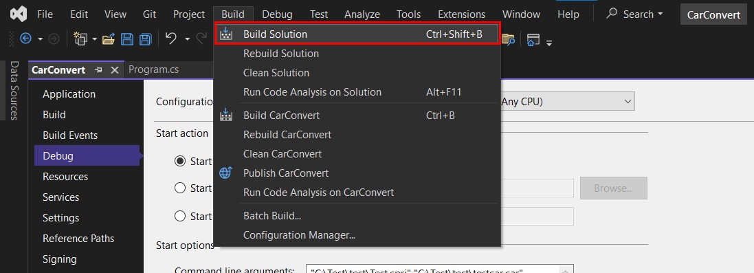 Note: The CarConvert Project has to be built first so that the carconvert.exe executable is created.