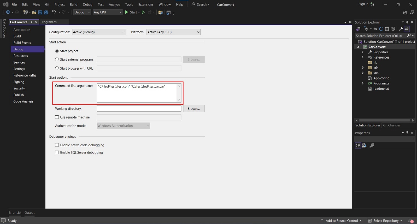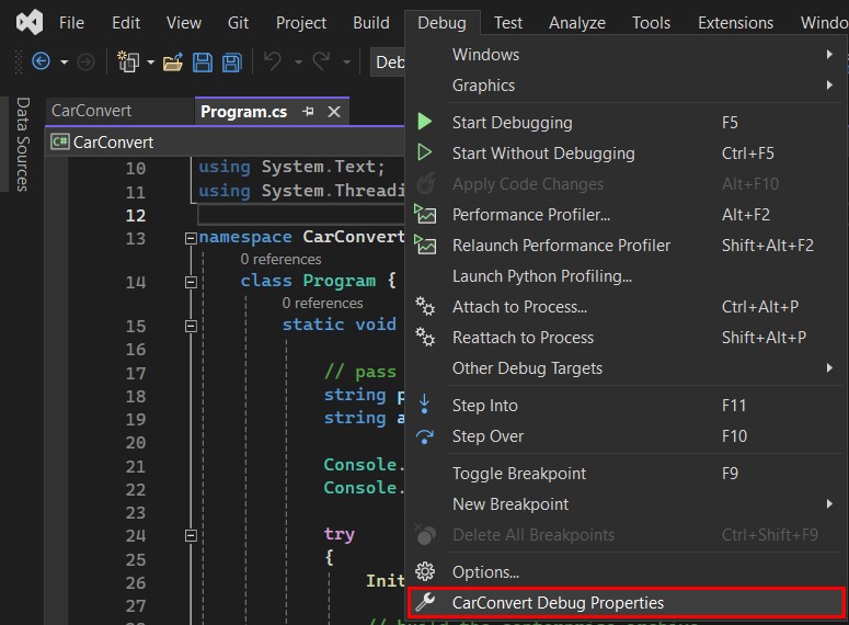 In your IDE, navigate to Debug > CarConvert Debug Properties.