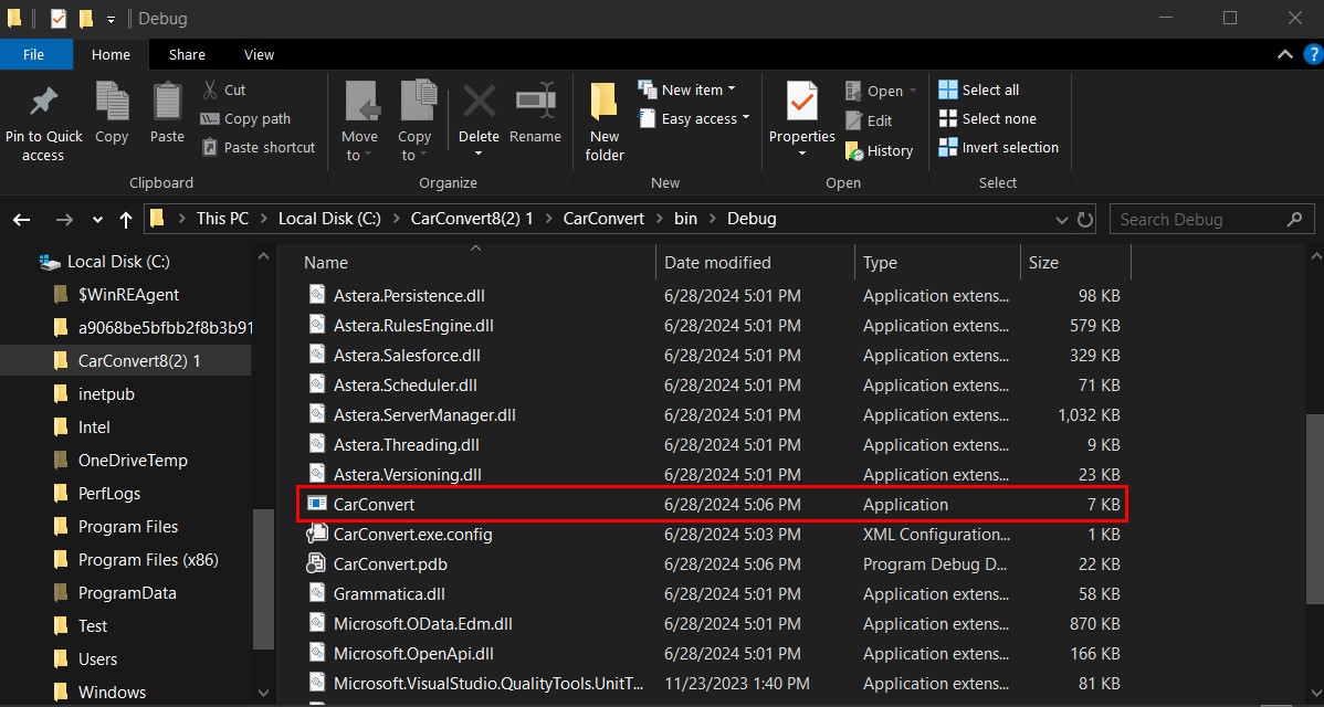 After building the project, navigate to the path where the executable is created. This is typically found at CarConvert > bin > Debug > CarConvert.exe.