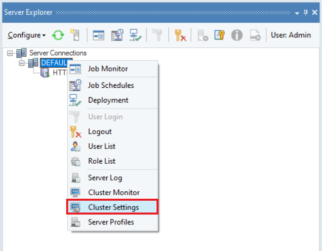 To open the Cluster Settings panel, go to the *Server Explorer > Right Click on Default > Cluster Settings*.