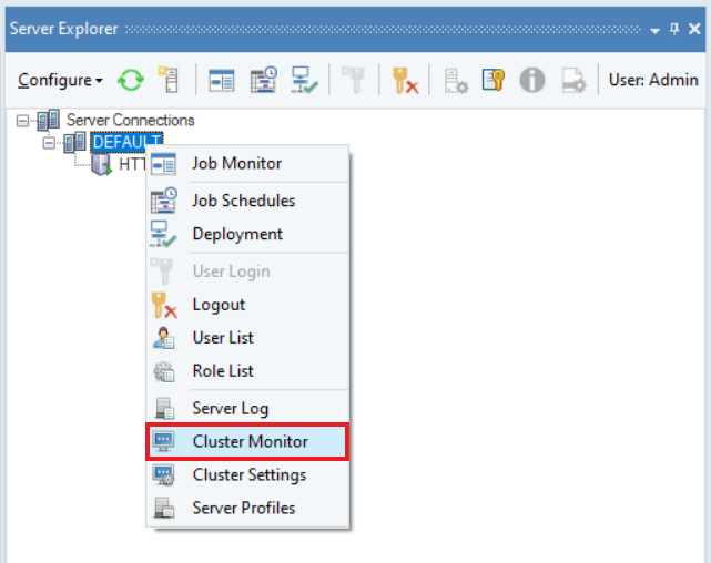 To open the Cluster Monitor, go to the *Server Explorer > Right Click on Default > Cluster Monitor*.