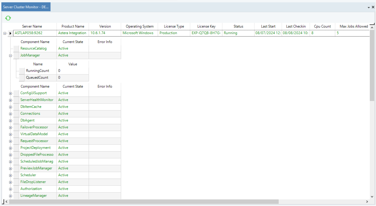 The cluster monitor shows us details about all clusters on our server. It also tells us information about which product is running on a particular server, it's version, operating system, type of license as well details such as how many jobs are running and queued and more.