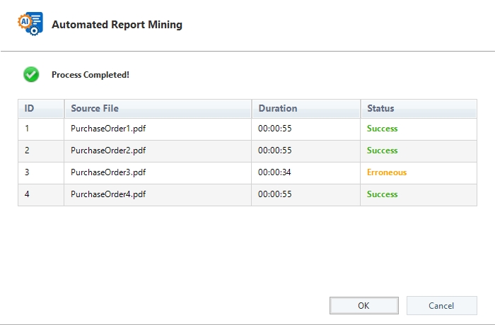 In case the file does not contain the required fields, the status is shown as "Erroneous" and generated templates will be kept in the Erroneous Report Models folder that has been created in the project.