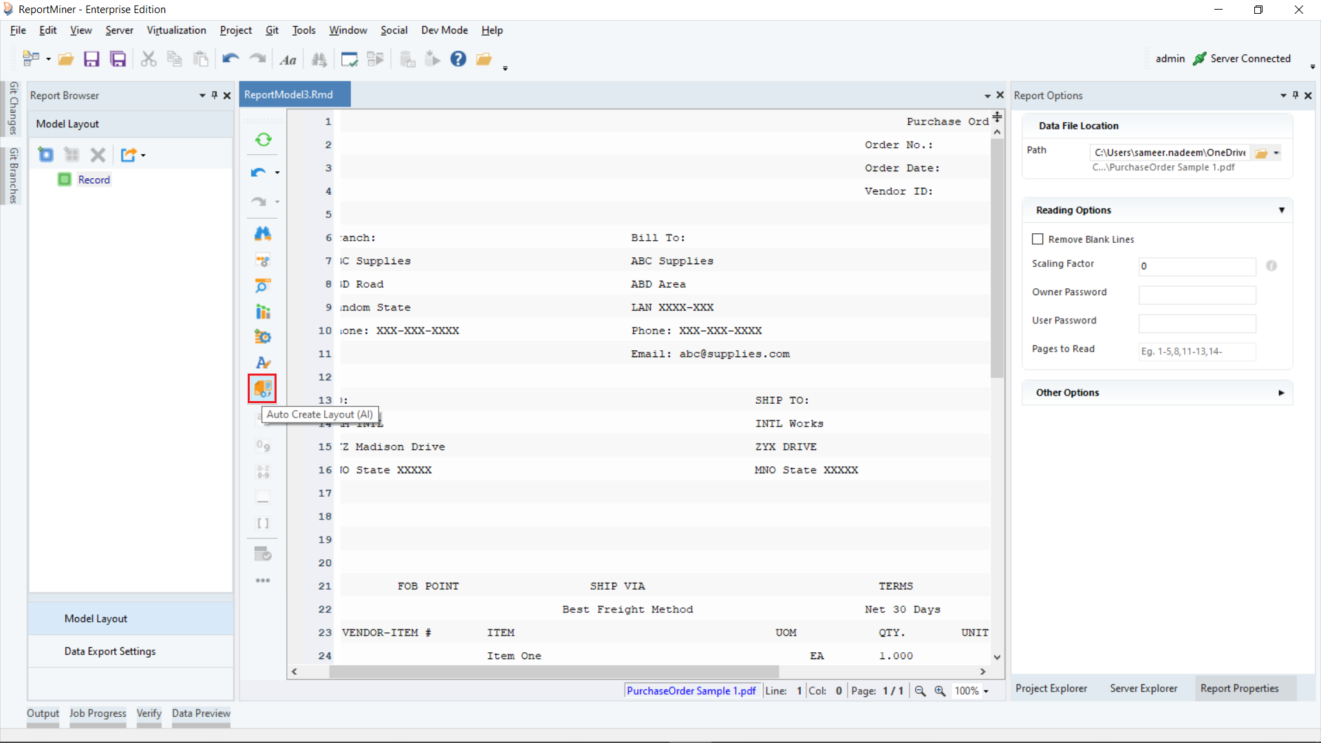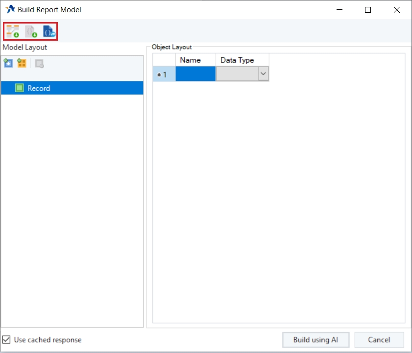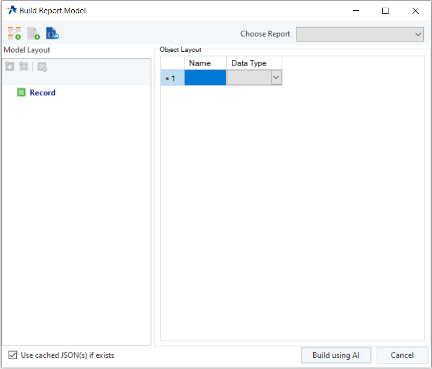 For standalone report model layout creation, open a new report model with the file. Then select the Auto create Layout (AI) option from the toolbar.