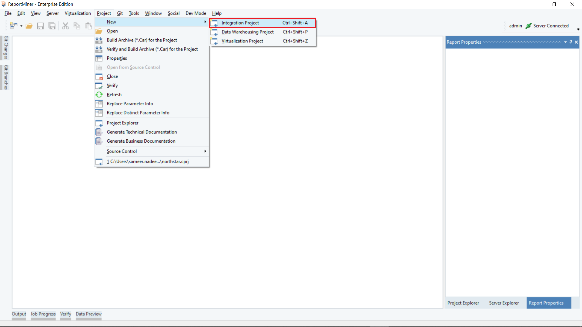In order to utilize the Astera North Star feature, you will need to create a new project from Project > New > Integration project or open an existing project in Astera.