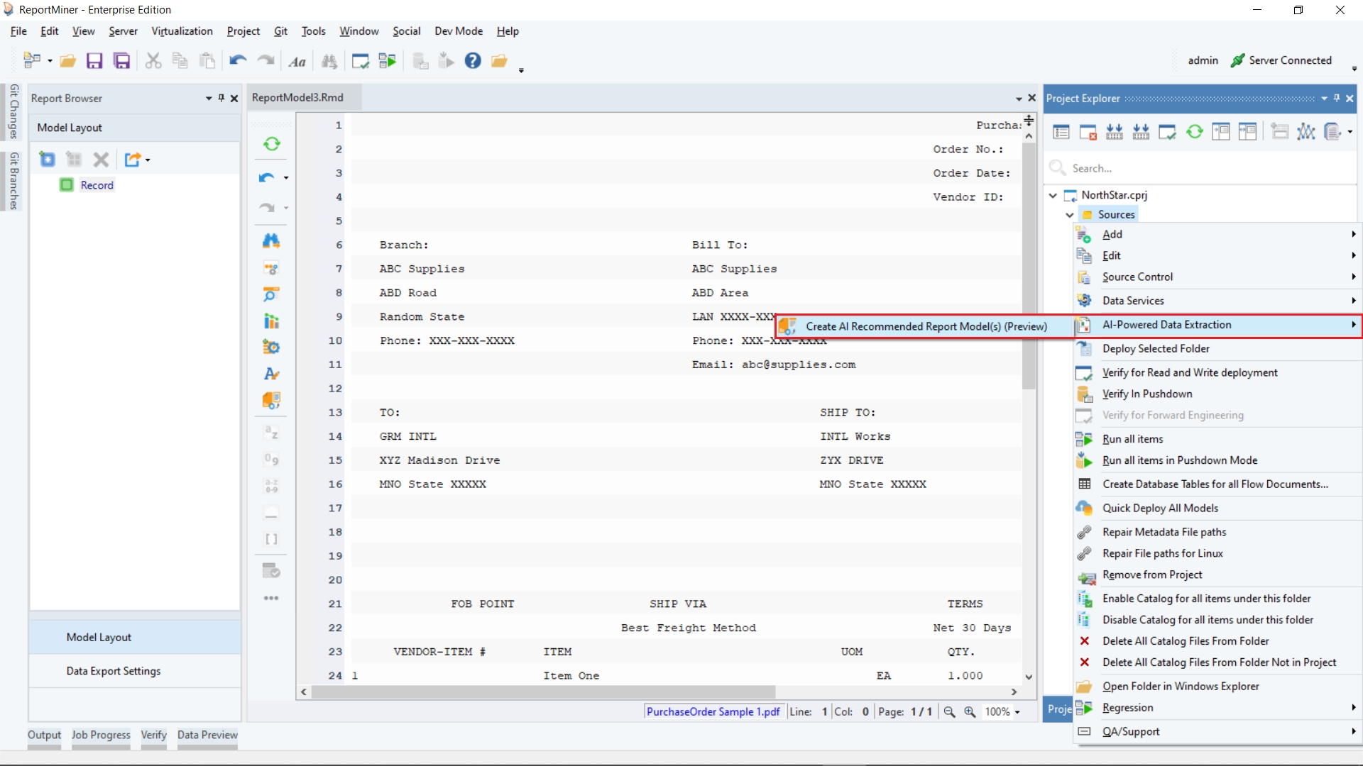 Next, right-click on the source files folder in the project explorer and select AI-Powered Data Extraction > Auto Create Report Models using Astera North Star.