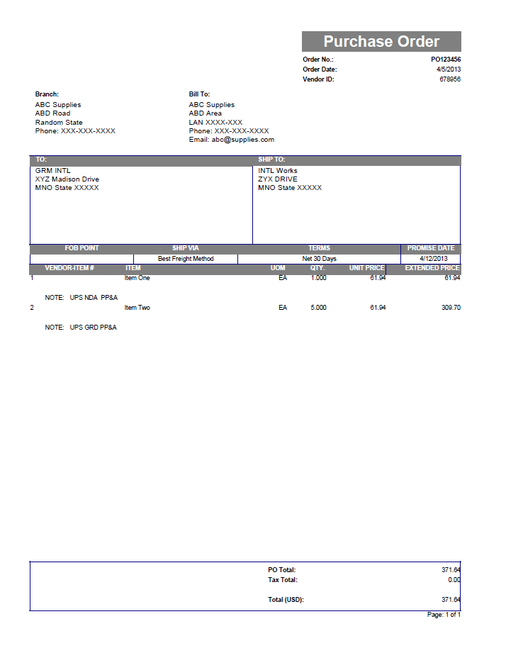 In this case, we have a few purchase order PDFs which contain key value pairs - such as Order No. and its value - at the top of the document, a table and then a key value pair at the end, as shown in the document below.