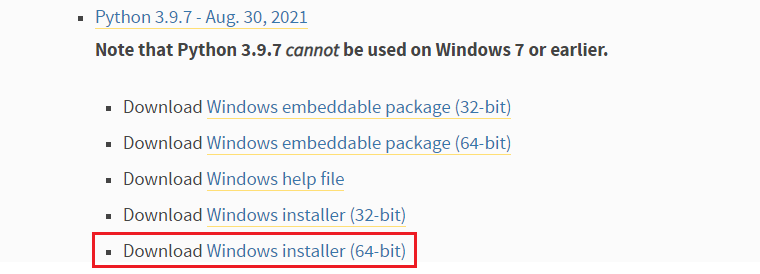 1. Visit this link and proceed to download the 3.9.7 Windows Installer (64-bit).