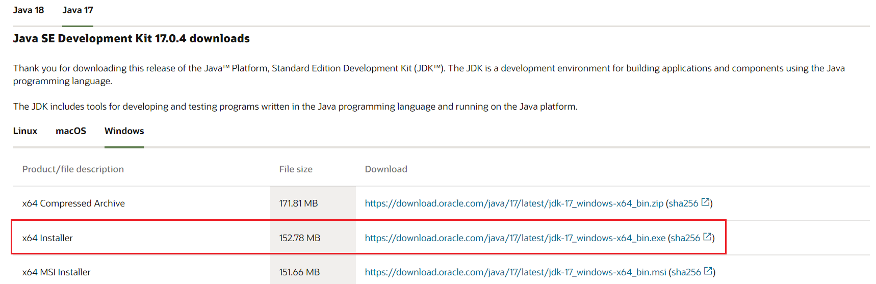 1. Visit this link and proceed to download the Java 17 x64 installer.