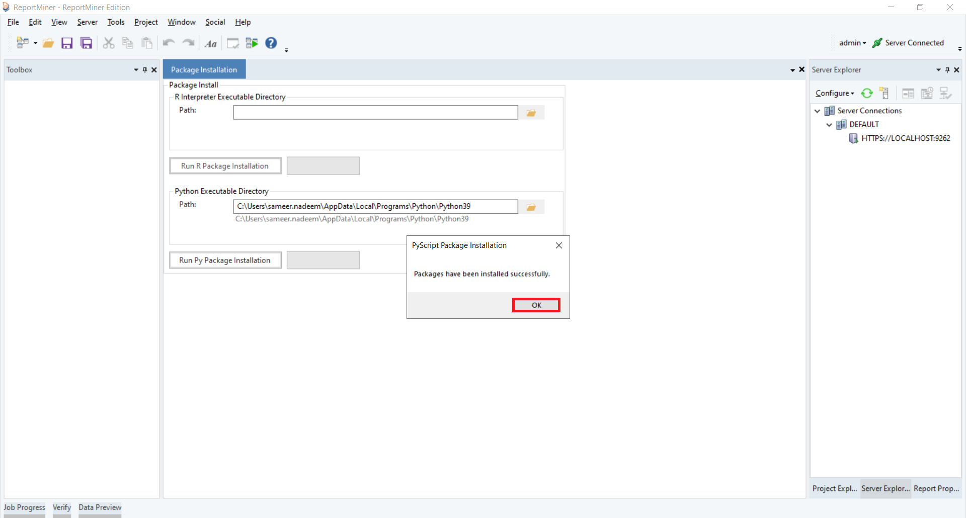 7. Once the installation is completed, a dialogue box will pop up, notifying you that the package installation was successful. Click OK.