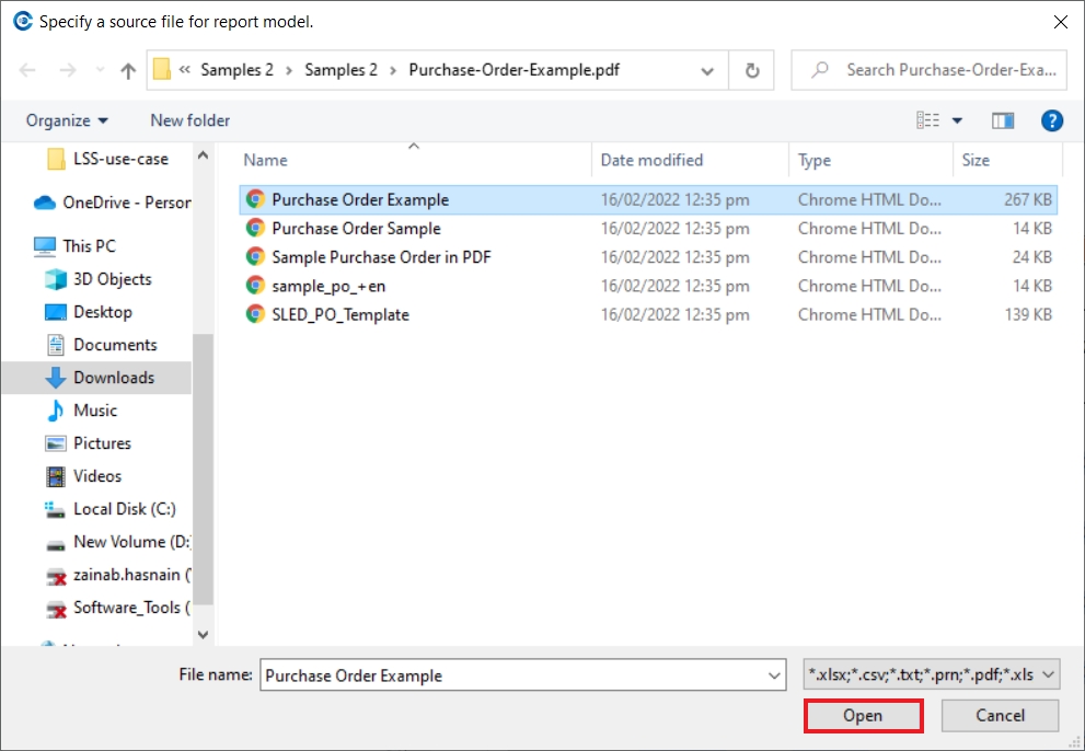 A pop-up window will open, asking you to specify the path of the source file you want to extract data from. Locate the directory containing the source file, select the file, and click Open.