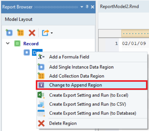 To change your append region to a data region, right-click on the append data region in the Model Layout panel and select the Change to Data Region option from the context menu.