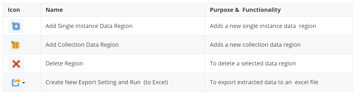 The icons placed on the top of the Data Export Settings panel perform different functions related to data export. A brief description for each of these icons is given in the table below: