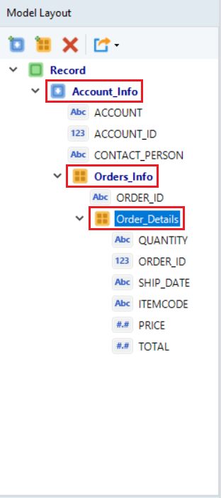 In the figure below, you can see an extraction model that has a hierarchical structure. This model contains a single instance region (Account_Info) as well as collection regions (Orders_Info and Order_Details).