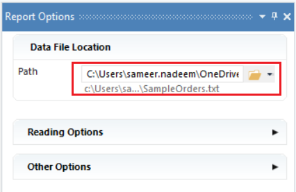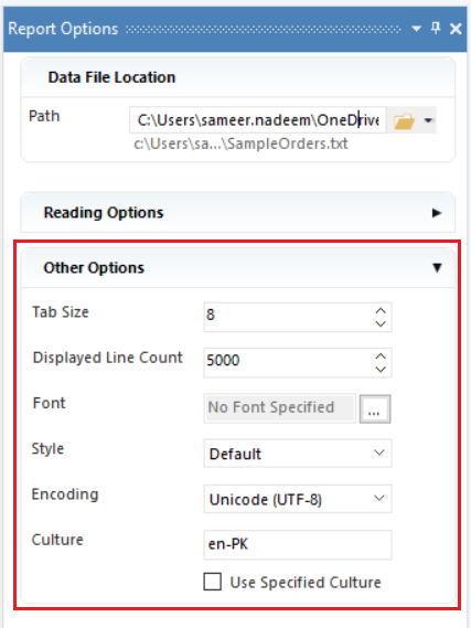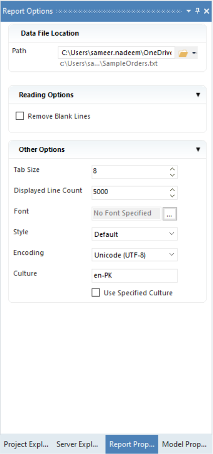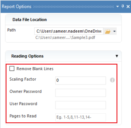 Report Options are used to specify or adjust the settings for the source file used for your report model. This window appears as you load a new source file to build an extraction template.