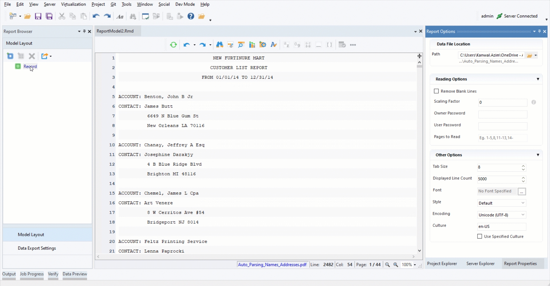 1. Load the unstructured source file in the report model designer.