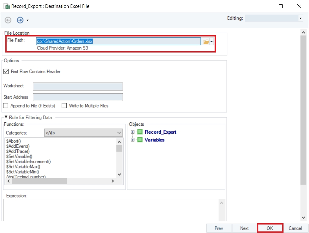 The file path is now pointing towards the Amazon S3 cloud provider. Click OK.