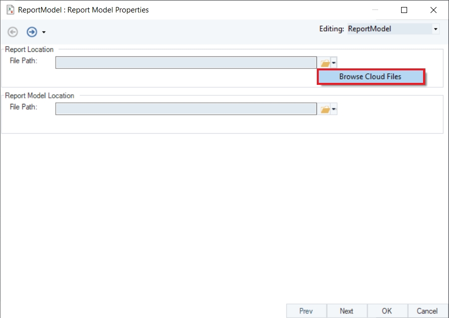 Open the report model. Go to the Report Options panel, and click on the arrow next to the folder icon in the Data File Location group-box. Select the Browse Cloud Files option.