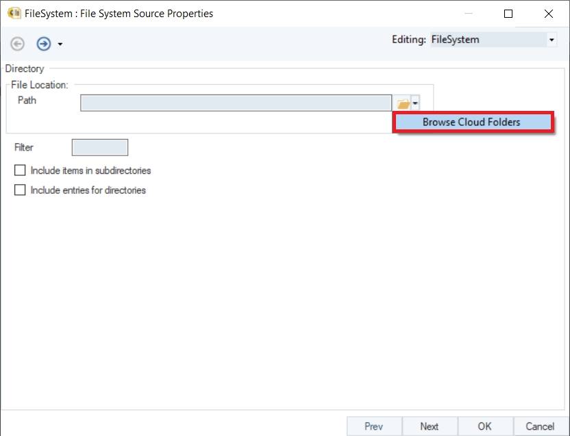 A configuration window will open. Click on the arrow next to the folder icon and select Browse Cloud Files option.