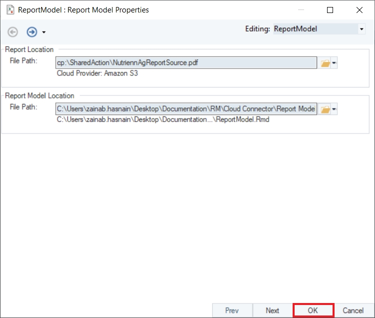 The Report Source object is now configured with a file path coming in from the Amazon S3 cloud connection and the report model from the local directory.
