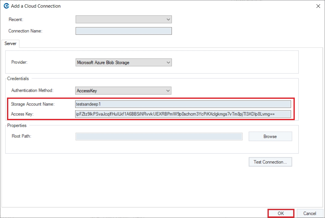 Provide relevant credentials by specifying the Storage Account Name and Access Key. Click OK.