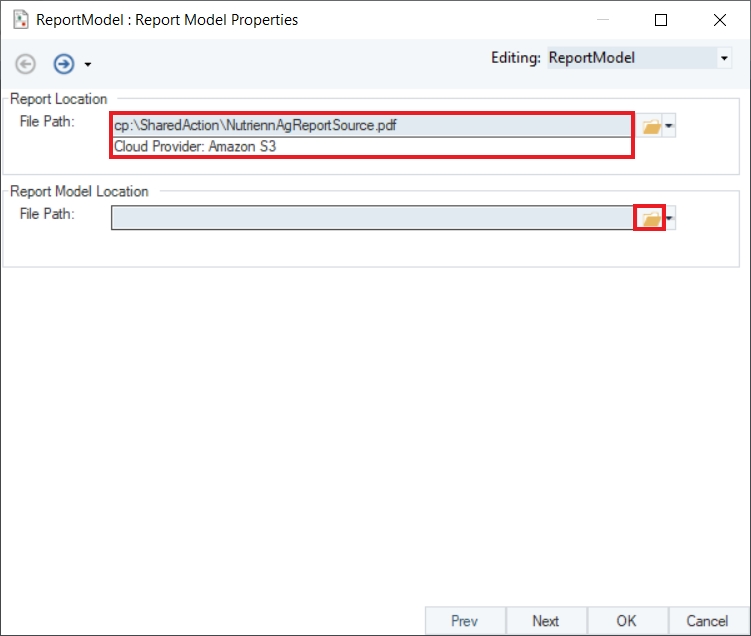 The File Path is now pointing towards the Amazon S3 cloud provider. Click on the folder icon to browse the report model from your local directory.