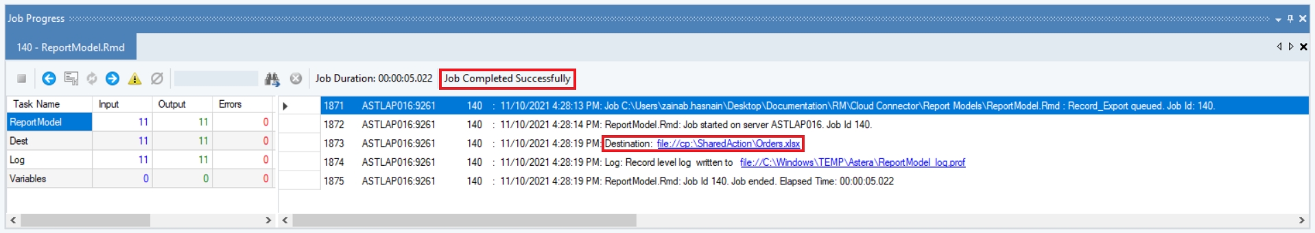 The Job Progress window shows the job status and the cloud path where the destination file has been created.