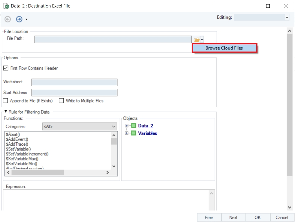 In this case, we want to read all the files from a particular cloud directory (in a workflow) and extract data from those files to write it in an Excel Workbook Destination (in a dataflow).