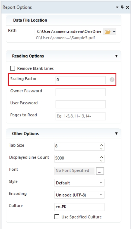 The Scaling Factor applies to your PDF’s spacing value. This option is located in the Report Options panel. The Scaling Factor depends on the PDF writer that was used to create the file. In many cases, PDFs contain different fonts, headers, and footers. This is why the scaling may vary considerably in different PDFs. These variations are converted into text form based on the software’s standard. This includes an equal size font for each character and equal space to allow for proportionate spacing. In many cases, these font and header variations used by the PDF writer cause the scaling to look off while converting. If this is the case, you can fix it by changing the Scaling Factor option.