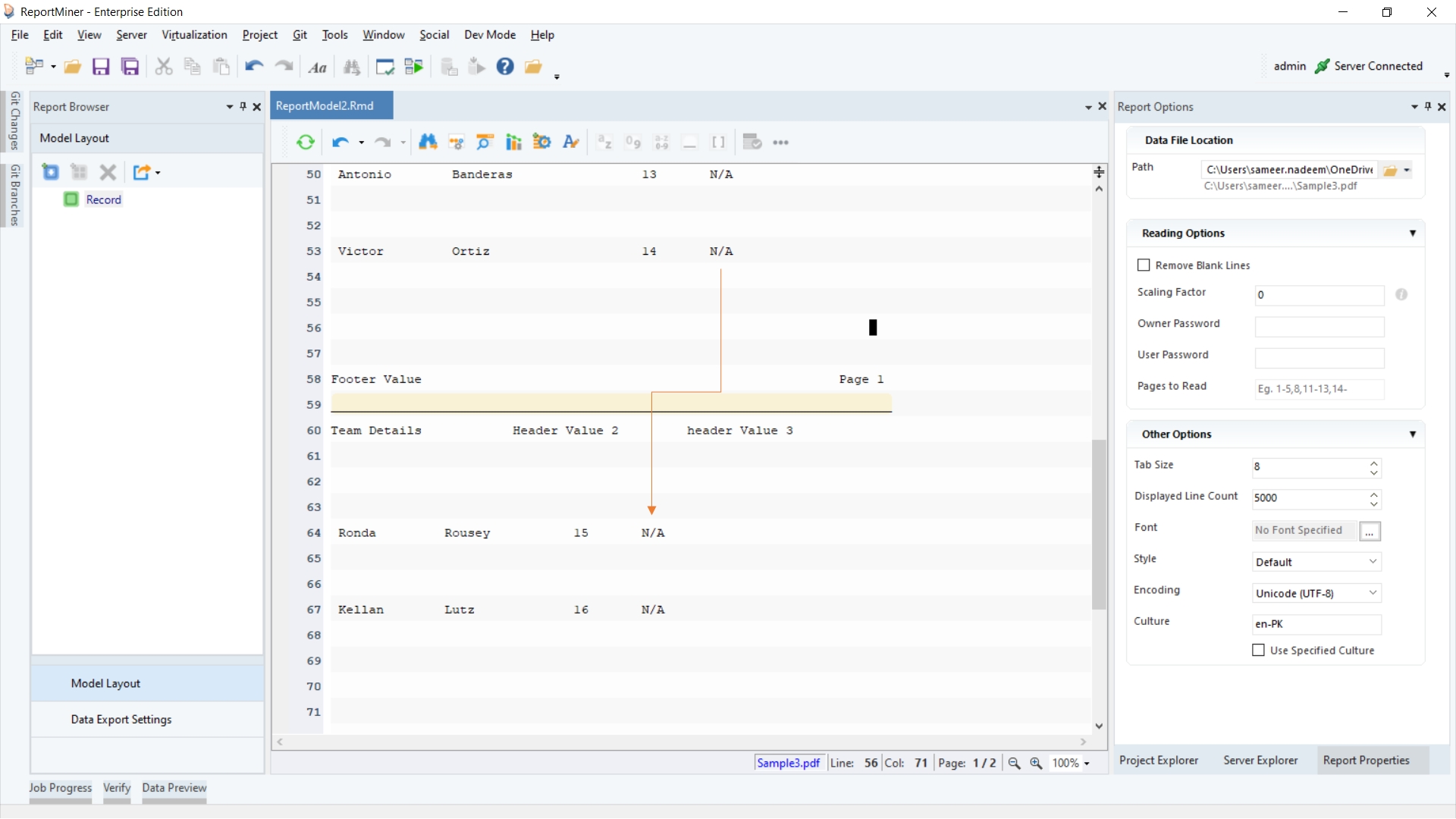 As you load the PDF file on to the Report Model designer, a Report Options panel will appear. Here, you can notice that the data is not properly aligned.