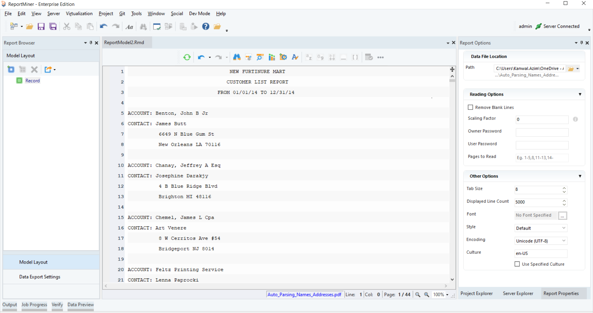 There are many options available in the Report Options panel to configure how Astera reads the unstructured PDF file such as specifying the scaling factor, font, tab size, and password.