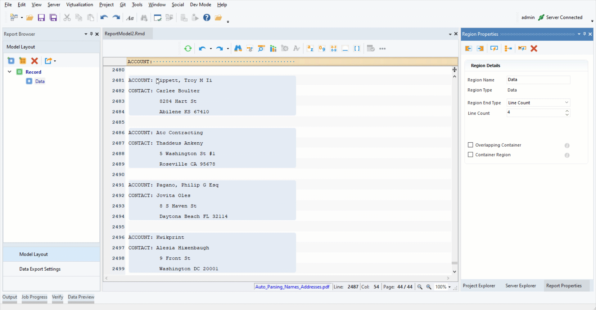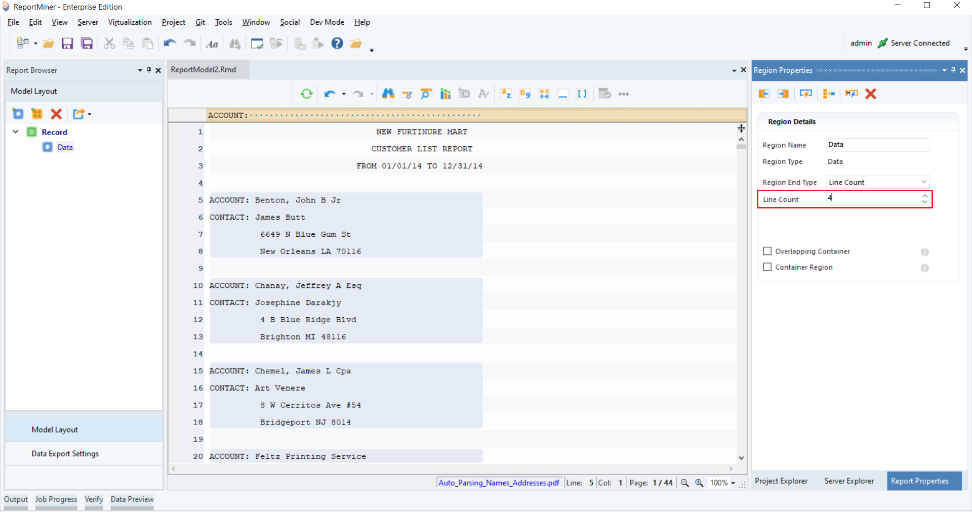You can see that a single record spans over 4 lines on this PDF file. In order to capture this data and place it into different fields, we will use the *Line Count* feature.
