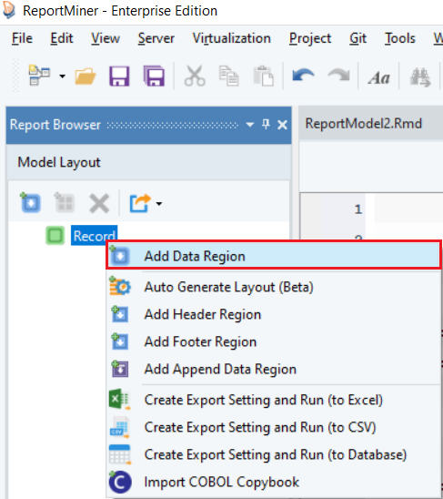 1\. Right-click on the *Record* node under the Model layout panel and select *Add Data Region* from the context menu.