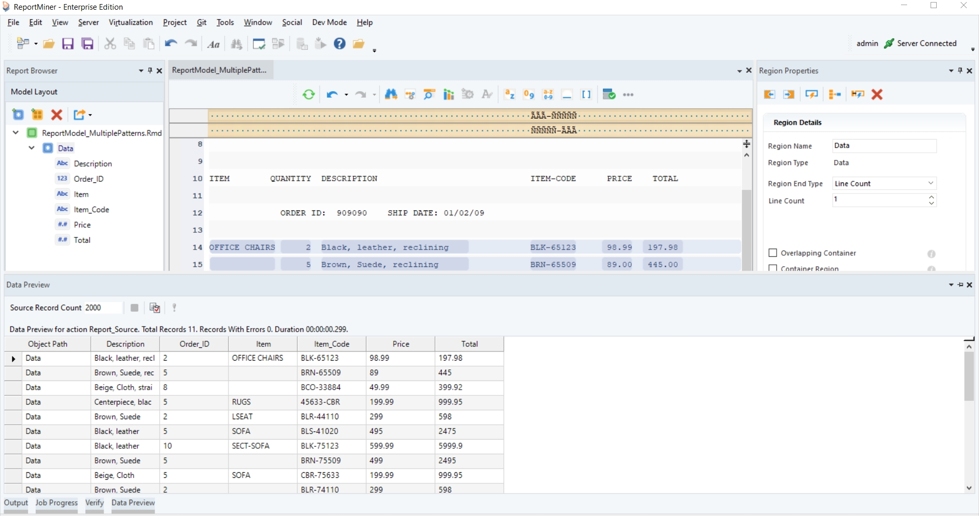 A pattern-matching bar and Region Properties panel will appear. And a subnode "Data" is added to the Record node in the Model Layout tab.