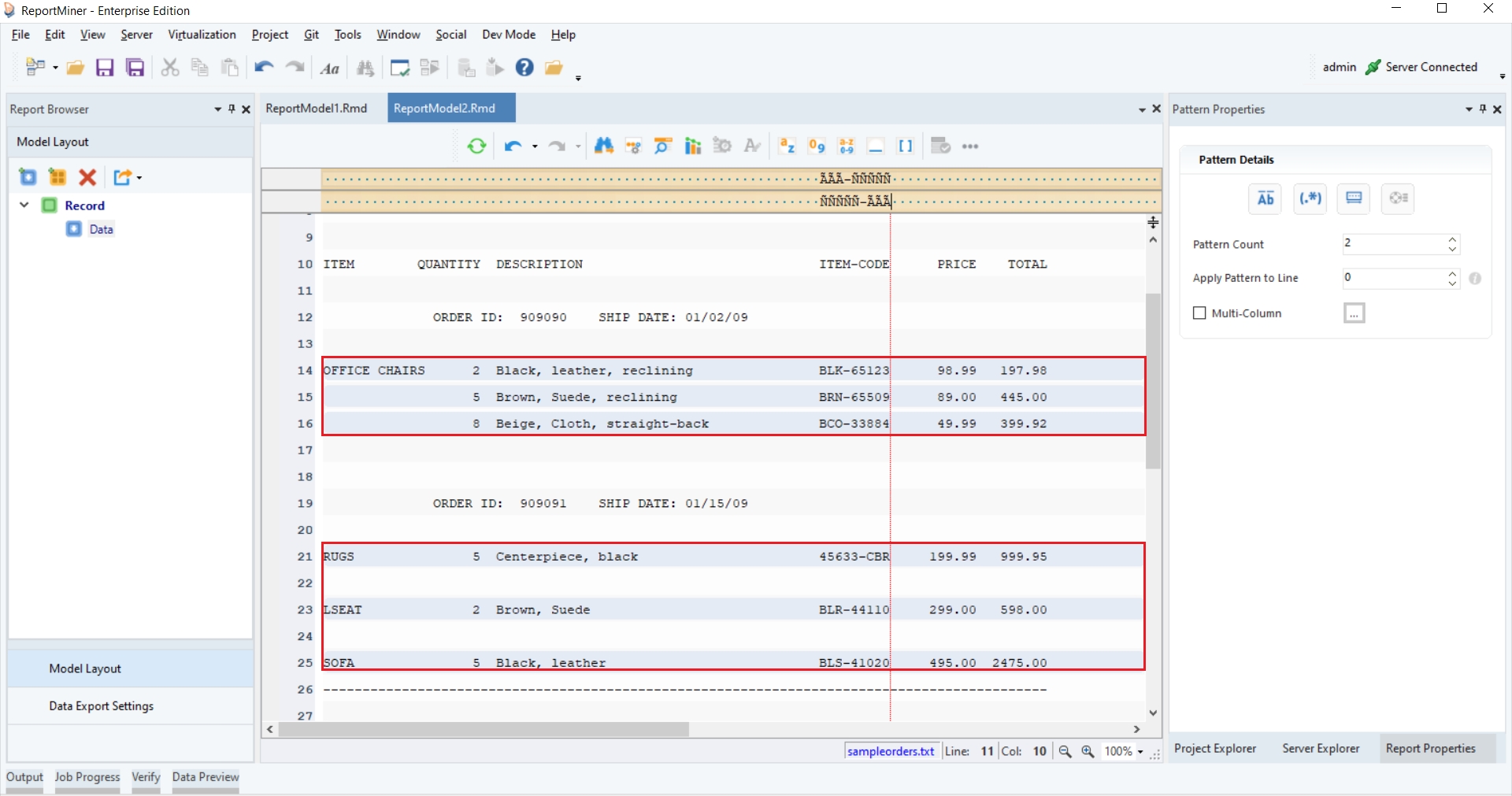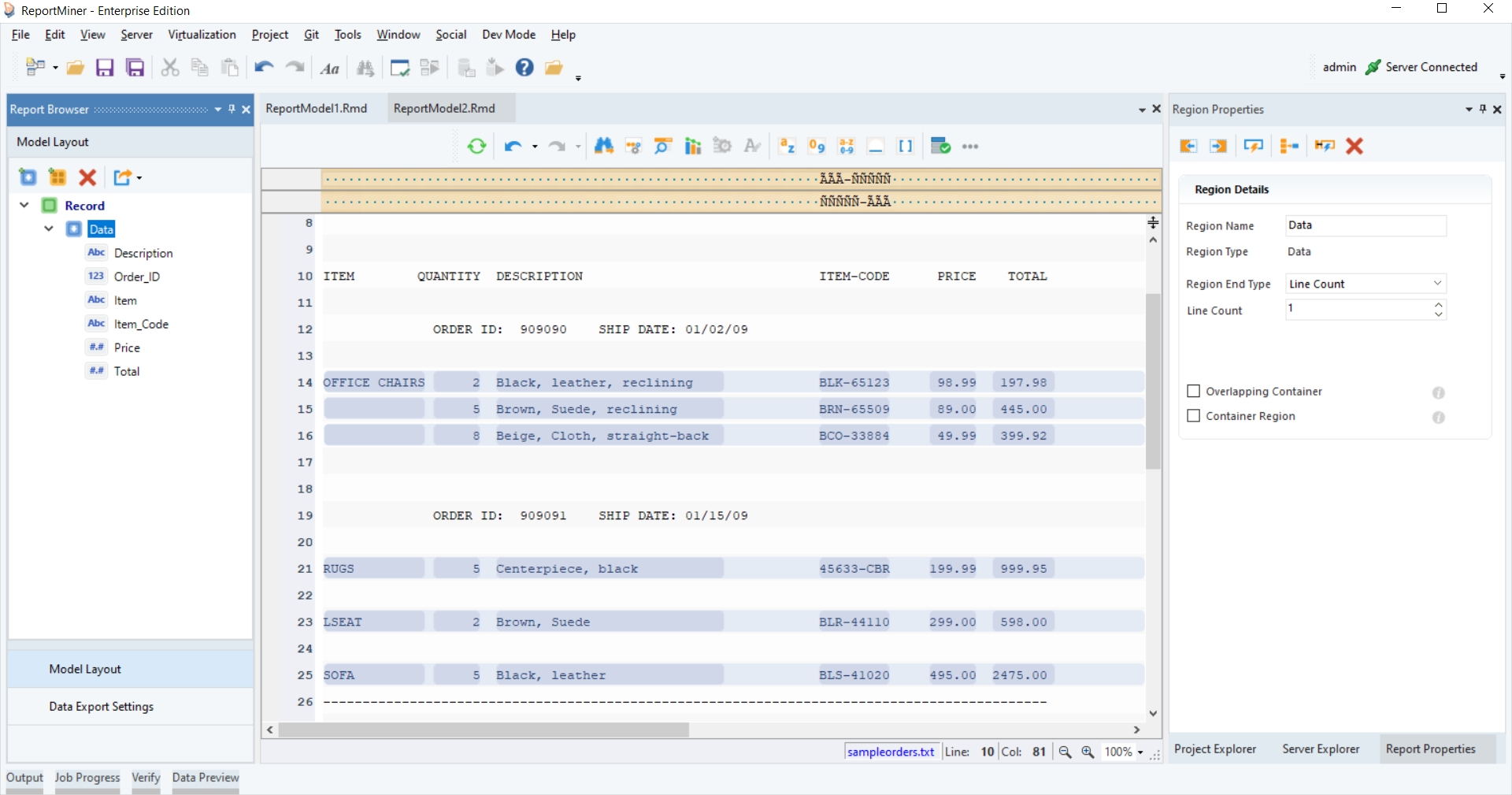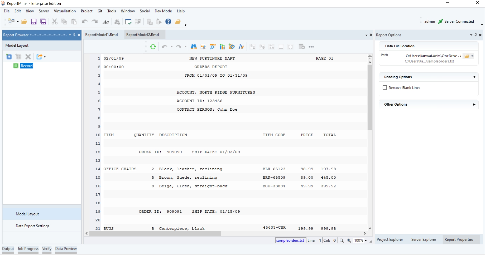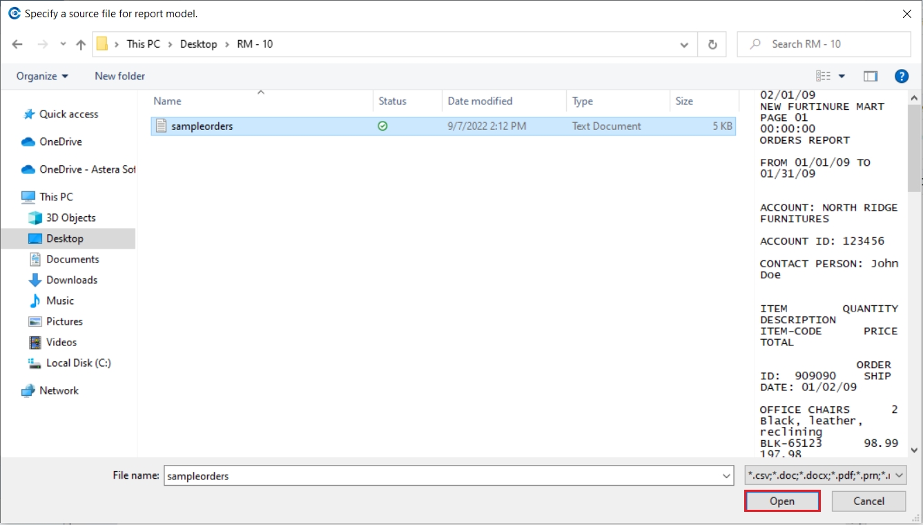Click Open. A text file containing information regarding orders to a fictitious furniture store will open in the report model.