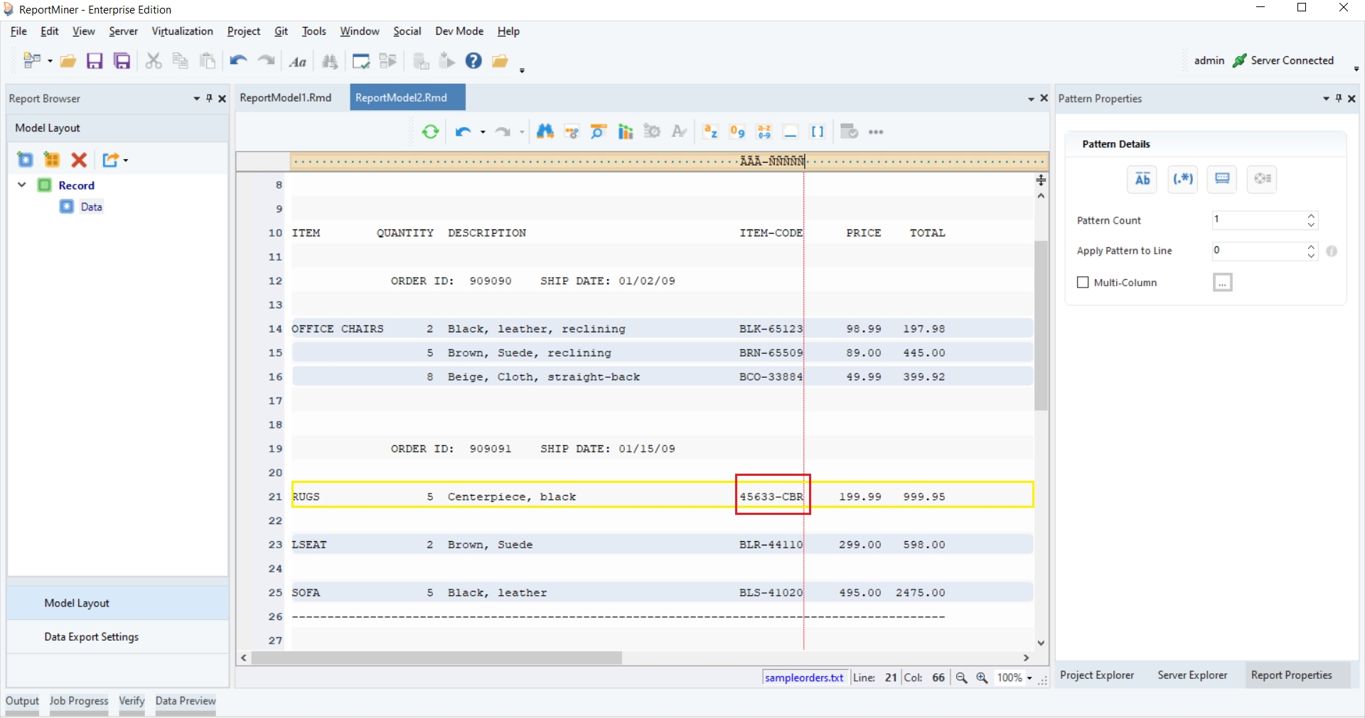 5. On the second pattern bar, we'll specify another pattern where the 5 digits come before the 3 alphabets, separated by a hyphen. Now, all the lines with item details have been captured completely in the data region.
